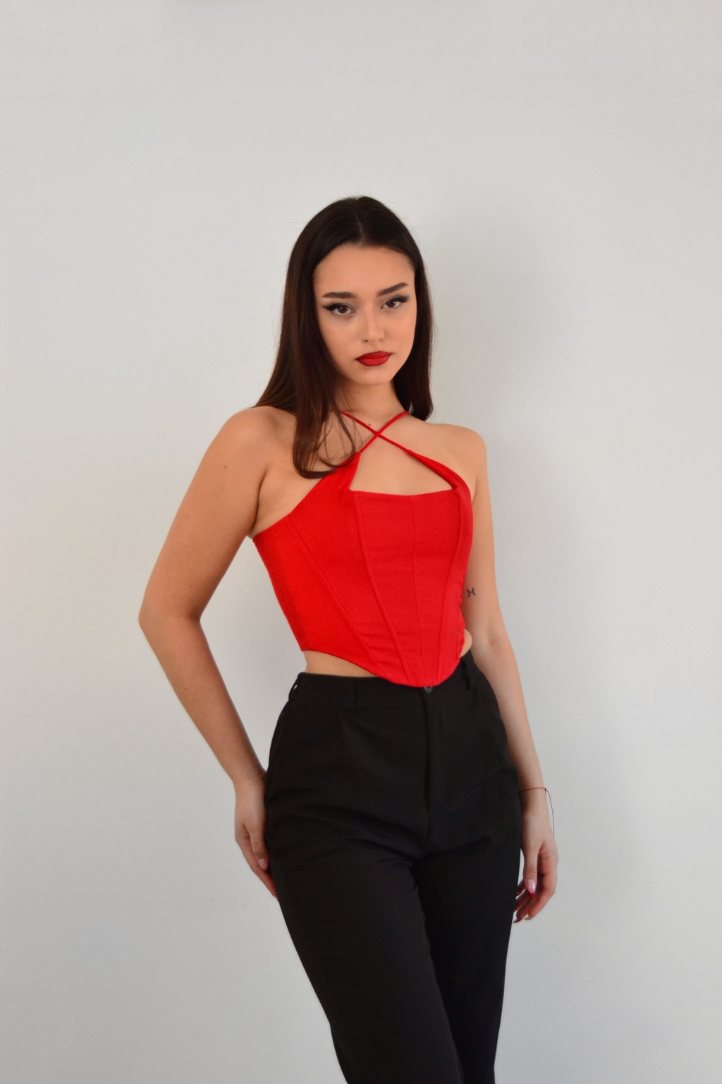 Corset realizado en crep cali y forrado con gabardina elastizada. Tiene ballenas de plástico y ojalillos en la parte trasera para ajustarlo a tu gusto.